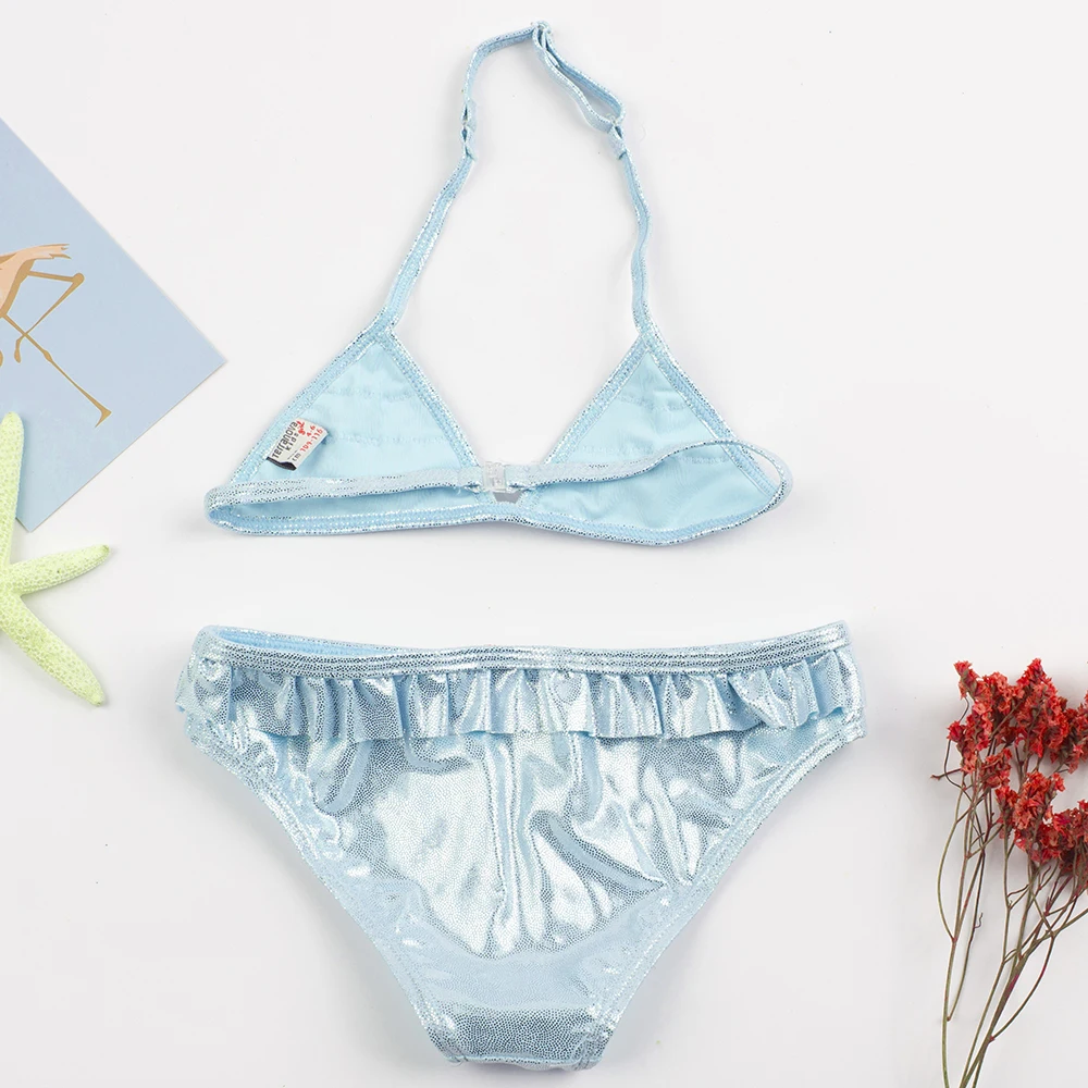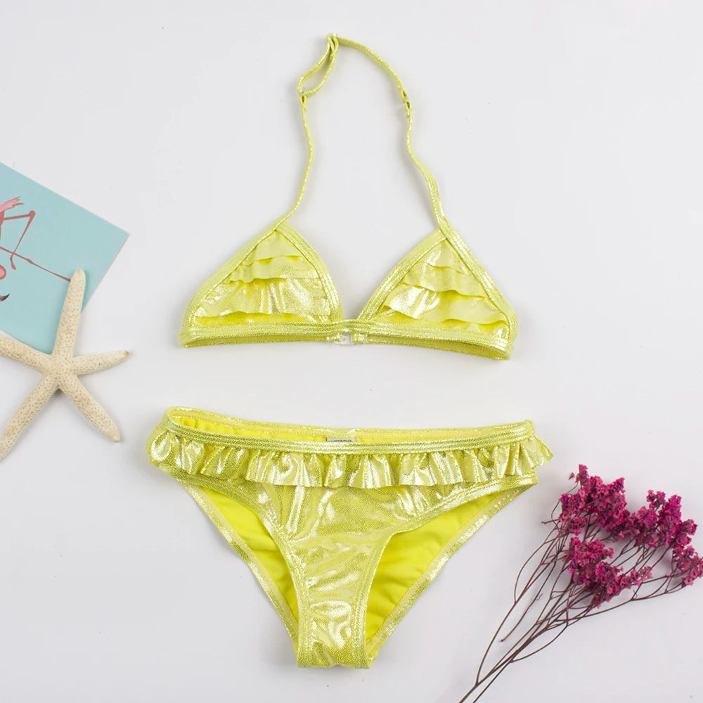 Shinning Ruffle Solid Summer Beach Girls Kids Swimwear Swimsuit Vacation Outdoor Play Adjustable Child Kids Bikini Set