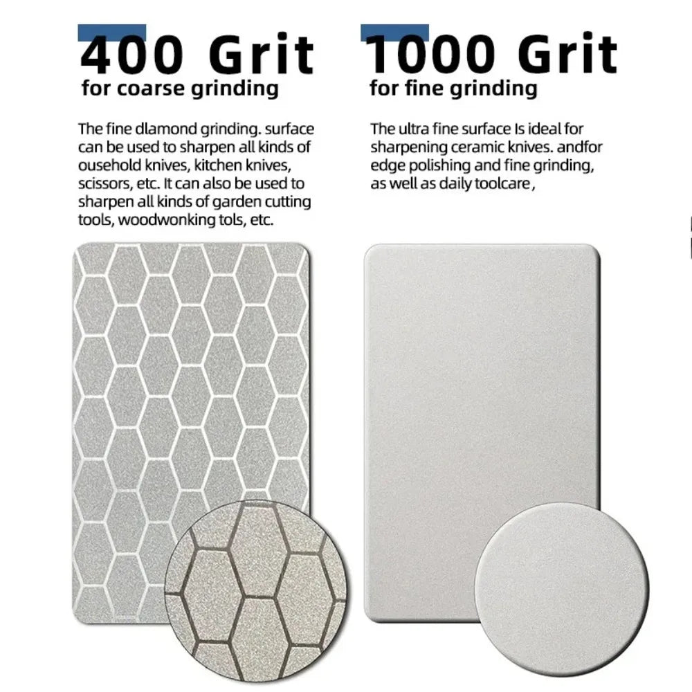 【EFFICIENT AND DURABLE】sharpening stone (400#/1000#) is made of high-hardness Titanium Coated Diamond.the material hardly wears out,the sharpening stone has a long service life,and the honeycomb-shaped concave-convex design ensures the dust generated during the grinding process will not affect the sharpening,thus speeding up the sharpening,save your precious time.