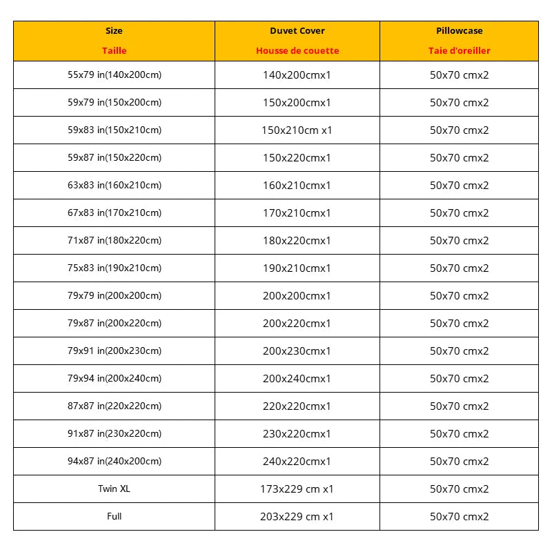 ● 55x79 in(140x200cm):Duvet Cover 140*200cmx1 pc, Pillowcases 50*70cmx2pcs;